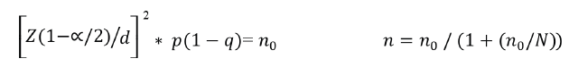 Donde n es el tamaño de hogares de la muestra, N es la cantidad total de hogares, p es la probabilidad de ocurrencia que un hogar forme parte de la muestra y su contraparte, q es la probabilidad de no ocurrencia de ser elegido en la muestra, Z es un estadístico que equivale generalmente a 1.96 para el 95 de confianza (distribución normal), d es el error máximo de estimación, α es el nivel de confianza y n0 es la muestra estimada. Los valores considerados para N fueron 1,067; 1,168; y 1,517 hogares (para 1997, 2004 y 2011 respectivamente), Z=1.96 (para 1997 y 2004), Z=1.64 (para 2011),5 p=0.5, q=0.5, α=0.95 (para 1997 y 2004), α=0.90 (para 2011) y d=0.1 (para todos los años considerados).