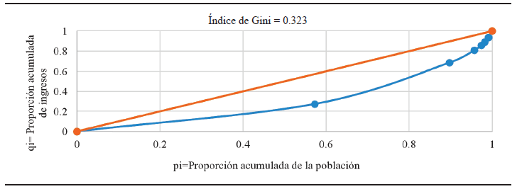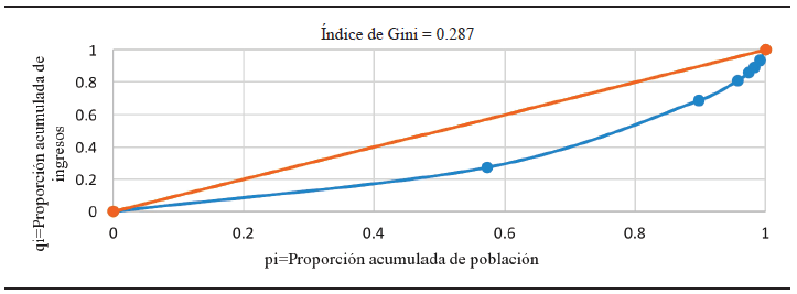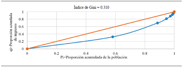 Los cálculos del índice de Gini y sus respectivas curvas de Lorenz fueron estimados usando Excel® y se interpretaron de acuerdo con los criterios establecidos por la teoría, es decir, 1 para la perfecta desigualdad en la distribución del ingreso y 0 la perfecta igualdad en la distribución del ingreso. Por su parte, la curva de Lorenz, al ser proporciones, se interpretó en términos reales al relacionar el eje X como la proporción acumulada de población y el eje Y la proporción acumulada de ingresos. En general, los resultados de la simulación son interpretados para conocer el funcionamiento de la economía durante el periodo estudiado y se relacionan con la evolución de la pobreza y desigualdad económica para proponer políticas públicas que se transformen en desarrollo sostenido para el municipio de Hocabá.