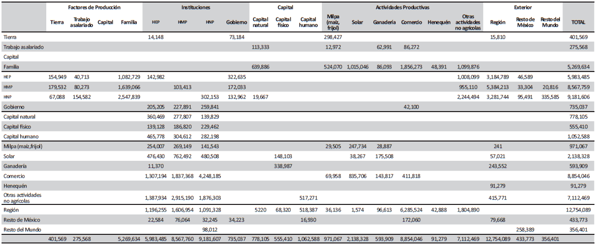 Para la construcción de las MCS para cada año, se siguieron los mismos criterios de cargos y abonos (partida doble); al igual se tomaron en cuenta cinco rubros para la integración de las cuentas; los factores productivos (tierra, trabajo y capital), instituciones (hogares en pobreza extrema, hogares en pobreza moderada, hogares no pobres y gobierno), actividades productivas (milpa, ganadería, comercio, parcela, solar, apicultura, henequén),6capital (humano, físico y natural), y cuentas del exterior (resto de la región, de México y resto del mundo). Para los factores productivos, se incluyó el valor de mercado o el valor implícito de los factores tierra, trabajo y capital poseído por los hogares; en tanto, la decisión de nombrarlas dependió de la importancia de la cuenta, por ejemplo, en el rubro de instituciones se consideraron los hogares por su nivel de pobreza, pero que previo a la construcción de las MCS fueron clasificadas. Para el rubro de las actividades productivas, las cuentas creadas como apicultura, milpa, ganadería y otras fueron incorporadas considerando los resultados de investigaciones previas contempladas en el Plan de Desarrollo Forestal para Yucatán (SEDE, 2004). Sobre las cuentas de capital, se consideraron el capital natural, capital humano y capital físico. El capital natural consideró la valoración de los recursos naturales (a precios implícitos) que son extraídos de la selva de Hocabá (leña, madera para construcción, hojas o árboles medicinales y carbón vegetal). Por el capital físico se consideró la valoración de la infraestructura construida por los hogares (edificaciones terminadas o en proceso); por capital humano se incluyeron todos los gastos educativos hechos en los hogares (desde educación primaria hasta universidad). Para el rubro de cuentas del exterior, se contemplaron las relaciones de los hogares (ingresos o gastos) desde la región, con México y resto del mundo (como las remesas). Todos los valores incorporados en las MCS vinieron, por tanto, de lo declarado por los hogares para los tres años en las cuales se aplicaron las Matrices de Contabilidad Social.