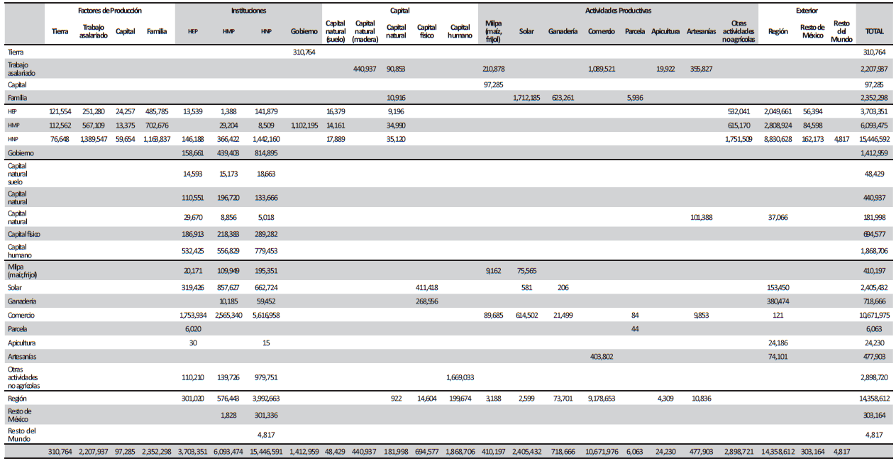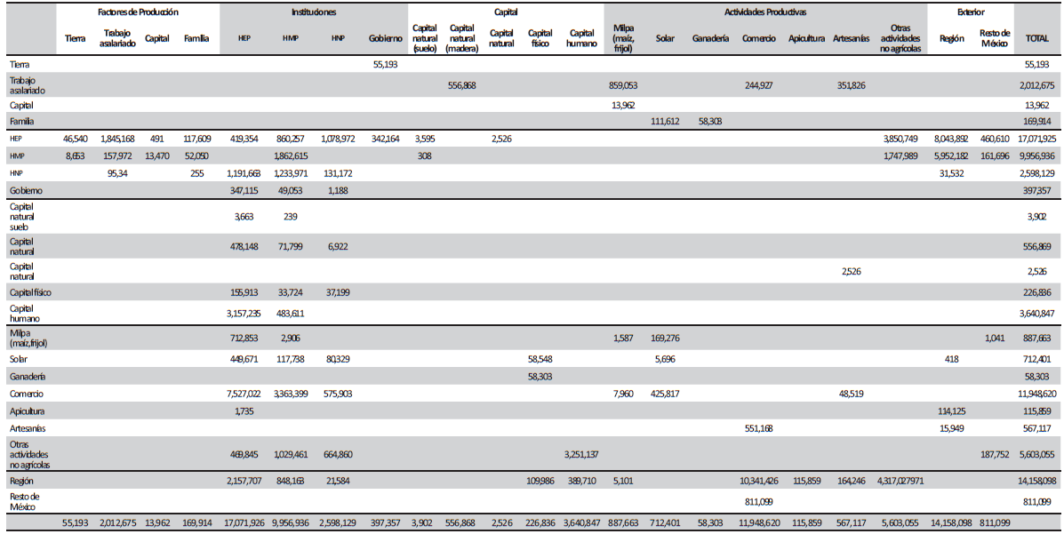 Las Matrices de Contabilidad Social (MCS) aplicadas a comuni dades rurales no es nuevo y su aplicación es numerosa en la literatura disponible. Ya existen trabajos para conocer el impacto en la estructura económica de una comunidad ante un incremento en las remesas provenientes del exterior (Candila, 2016), así como para determinar la importancia de las instituciones financieras (Cutrim y Ferreira, 2015). También hay investigaciones que le dan un enfoque de sustentabilidad, como Mardones y Saavedra (2011). Un estudio relacionado con la presente discusión se encuentra en Becerril y Albornoz (2010) cuando construyen una MCS para una comunidad rural y concluyen que se debe fomentar la producción de miel y artesanías, pues impulsa con mayor ímpetu el desarrollo comunitario.