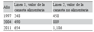 Para clasificar los hogares por su tipo de pobreza fue necesario usar la metodología de los Programas de Desarrollo Regional Sustentable (PRODERS) a partir de la Canasta Normativa Alimentaria (CNA), la cual contempla dos líneas de pobreza que se establecen por medio del valor de una canasta de bienes alimentarios y no alimentarios que los hogares deberían poder comprar con su ingreso per cápita mensual (Toledo y Bartra, 2000: 286). Las líneas de pobreza7 para 2004 y 2011 fueron establecidas para zonas rurales deflactando el efecto inflacionario (cuadro 1).