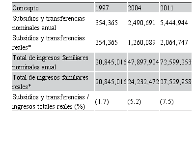 Los ingresos totales familiares están formados principalmente por trabajo remunerado, transferencias y subsidios del gobierno e incluye el programa Oportunidades (hoy Prospera) y Procampo (hoy ProAgro). De acuerdo con la información recopilada, los subsidios y transferencias fueron crecientes en Hocabá desde 1997 hasta 2011 (cuadro 2), en términos nominales y reales, y representan un porcentaje mayor a lo observado a nivel nacional, según González y Fuentes (2010), quienes afirman: “los ingresos por transferencias del gobierno hacia los hogares representan el 2.7% del ingreso total de los hogares”. Así, dentro del periodo estudiado (1997-2011), el incremento de los subsidios y transferencias en términos reales fue de 482.7% al pasar de $354,365 a $2,064,747 pesos; el total de ingresos familiares reales (incluyendo subsidios, transferencias, sueldos y salarios remunerados) se incrementó en términos reales en 32.07% al pasar de $20,845,016 en 1997 a $27,529,958 en 2011. Se observa que los montos de subsidios y transferencias recibidos son crecientes en términos nominales y reales; además su proporción sobre los ingresos totales fue relevantemente mayor en términos reales en 2011, por lo que la dependencia de los hogares hacia estos ha sido creciente (cuadro 2).