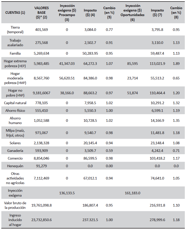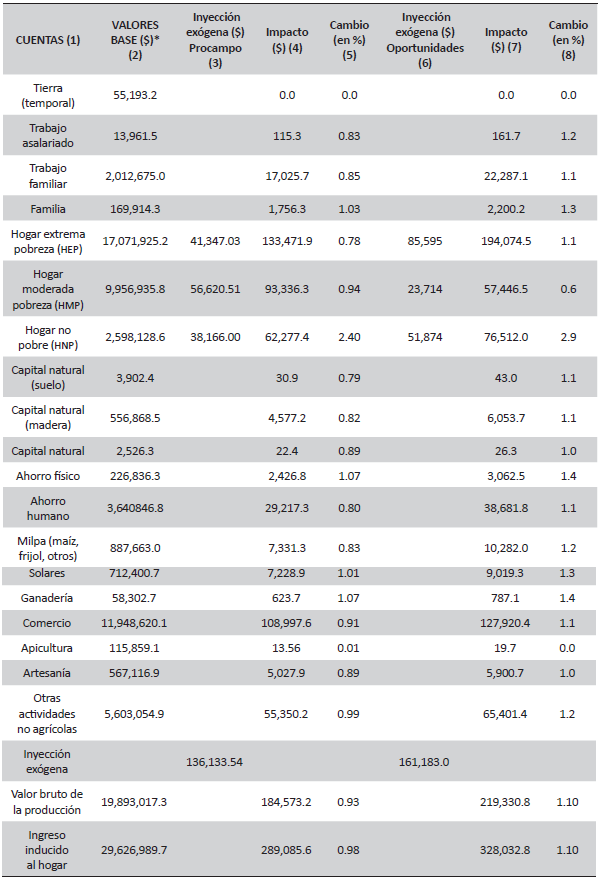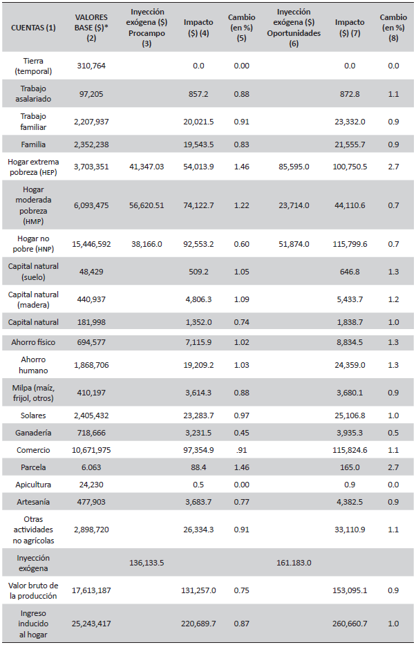 MCS, 2011.De acuerdo con los resultados, los HEP son impactados con $133,471.9, representado el 0.78% de incremento en los ingresos de los hogares de esta categoría. Sin embargo, los HNP recibieron los efectos más importantes por ser impactado en $62,277.4 (2.40%). Sobre la actividad productiva de la milpa, se recibió un impacto poco relevante de $7,331.3 (0.83%) y el comercio con $108,997.6 (0.81%). En relación con la economía local, el valor bruto de la producción es impulsado en $184,573.2 (0.93%), mientras el estímulo al ingreso inducidos de los hogares es de $289,085.6 (0.98%) (cuadro 5). Se concluye lo mismo para los resultados de las simulaciones del subsidio Procampo de las MCS 1997 y 2004; los impactos son relativamente pocos relevantes pero positivos (cuadro 4). Al comparar los resultados para las tres MCS, no se observaron impactos crecientes para la estructura económica municipal. En relación con el programa Oportunidades y de acuerdo con los resultados de las encuestas solamente los hogares HEP y HMP recibieron originalmente esta transferencia con $2,148,195 y $490,565 respectivamente, aunque para fines de simulación se considera como ejercicio una inyección exógena de $85,595, $23,714 y $51,874 hacia los hogares tipo HEP, HMP y HNP respectivamente. La transferencia tuvo un impacto importante en el municipio, en particular para los HNP en 2.9%, el mayor para la estructura económica; para el valor bruto de la producción se incrementó $219,330.8 (1.1%) del monto inicial; el ingreso inducido a todos los tipos de hogares aumentó $328,032.8 (1.1%) del monto inicial. De manera general, el municipio fue impactado de manera positiva, por ello este programa puede considerarse relevante para la economía, aunque el impacto al compararse con la MCS 1997 resulta similar (cuadro 5). Por tanto, no se obtuvo un impacto significativo para la economía municipal, según el escenario si se compara MCS 1997 y MCS 2011.