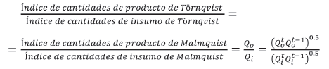 Por lo tanto, el índice de productividad de Törnqvist es una representación válida de la razón del índice de cantidades de producto de Malmquist con respecto al índice de cantidades de insumos de Malmquist. Esta es una relación importante porque provee otro argumento para el uso de los números índice de Törnqvist (u otro superlativo) (OCDE, 2001):