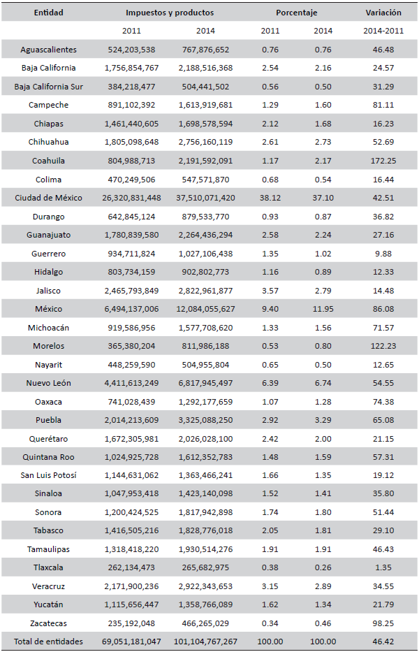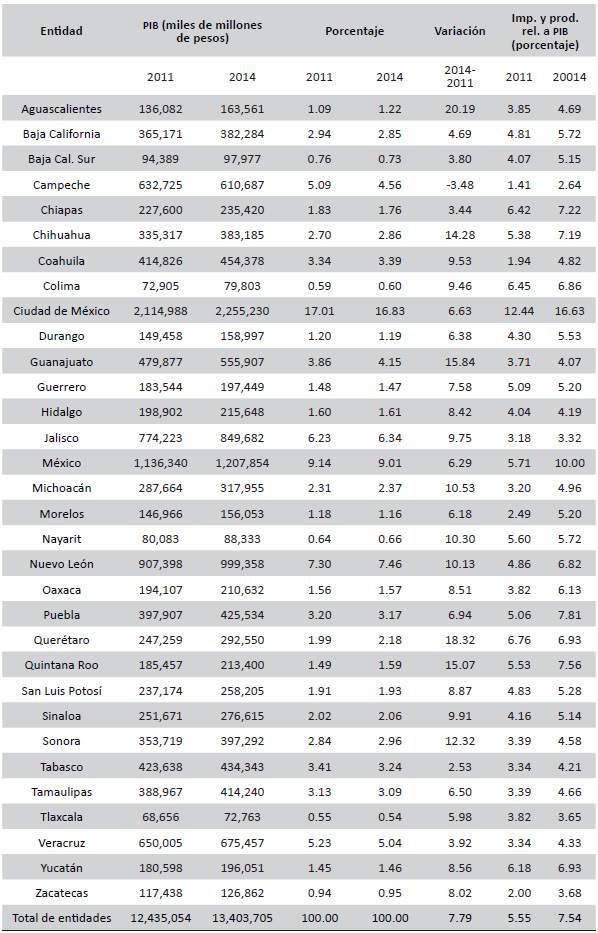 Para tener una medida relativa de la capacidad recaudatoria, consideramos el PIBE a precios constantes del 2008, esto nos ayuda a controlar la contribución del crecimiento estatal; es decir, permite considerar los estados más productivos y relativizar ese tamaño con respecto a la recaudación estatal; para ello calculamos los ingresos propios con respeto al PIB, ambas cifras estatales (tabla 5A); así, encontramos en 2014 solo dos entidades cuya recaudación de impuestos y productos representa 10 por ciento o más del PIB respectivo: la Ciudad de México (16.63 por ciento) y el Estado de México (10.00 por ciento), ambas aumentaron tales porcentajes entre 2011 y 2014.