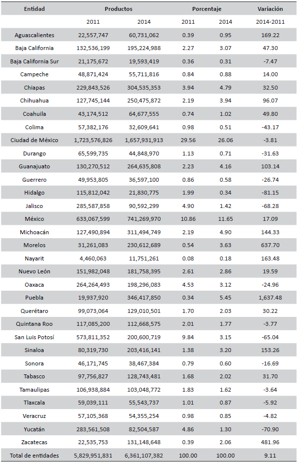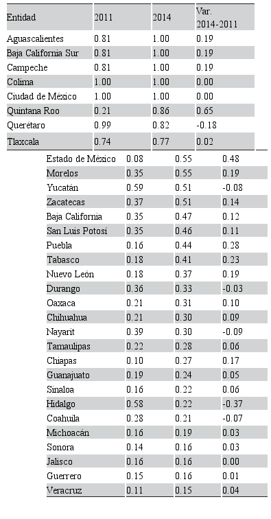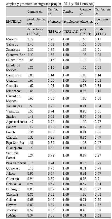 En 2014 fueron cuatro entidades: Aguascalientes, Campeche, la Ciudad de México y Baja California Sur. Con esto, dos entidades no cambiaron su nivel de eficiencia: Campeche y la Ciudad de México (2011 y 2014 fueron de las que definen la frontera de producción); diez entidades mejoraron su eficiencia relativa: Aguascalientes (0.16), Baja California Sur (0.18), Nuevo León (0.10), Tlaxcala (0.02), Morelos (0.19), Zacatecas (0.14), Estado de México (0.05), Tabasco (0.15), Quintana Roo (0.08) y Oaxaca (0.01); 20 entidades presentaron descensos en su eficiencia, dentro de ellos Yucatán (-0.50), Hidalgo (-0.47), Colima (-0.29), que en 2011 fue una de las tres entidades más eficientes, y Querétaro (-0.26) (tabla 1).