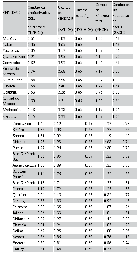 El cambio en la productividad total de factores (TFPCH) llegó a ser más alto en el caso de Morelos (2.61), del cual 0.65 se debió al cambio tecnológico (TECHCH) y 4.02 al cambio en la eficiencia (EFFCH) de esa entidad. Tabasco (2.36) y Zacatecas (2.05) también presentaron un cambio en la productividad superior a las dos unidades; Quintana Roo fue la cuarta entidad con el cambio en la PTF más alto (1.91) (tabla 4). Son los mismos estados con los cambios más altos en el análisis absoluto mostrado en el apartado anterior.
