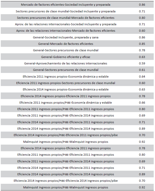 Nuestro trabajo buscará la correlación estadística mediante el coeficiente de Spearman para comparaciones múltiples entre los dos índices de Malmquist estimados, el índice de competitividad estatal 2012 del IMCO (con datos del 2010), con sus 10 subíndices y con los 11 componente del subíndice Gobierno. Por su parte, el trabajo comentado de Ramírez et al. (2017) encuentra que la correlación inversa entre el esfuerzo y la capacidad fiscales es no significativa en el nivel de confianza de 95 por ciento. De igual manera, hallan que la productividad fiscal tiene una correlación positiva con el nivel de esfuerzo fiscal no significativa en 95 por ciento de confianza. Por último, la productividad fiscal (medida como el índice de Malmquist) no tiene correlación significativa ni con el esfuerzo fiscal ni con la capacidad fiscal. En estos casos emplearon el estadístico no paramétrico de Spearman.