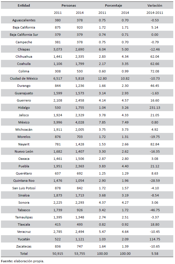 Podemos encontrar estados como el Distrito Federal (ahora llamado Ciudad de México) con el mayor número de empleados durante estos cuatro años, aun cuando tal cifra disminuyó en 699 personas en ese lapso en tal entidad, cabe destacar a Chiapas con 6.04 por ciento y 5.00 por ciento del personal en 2011 y 2014, respectivamente; hasta entidades donde son menos de 400 pero más de 300 personas las dedicadas a las labores de recaudación —ya sea directamente (cajeros) o indirectamente (supervisores, personal de limpieza, etc.)—: Aguascalientes, Baja California Sur y Campeche (tabla 1A).