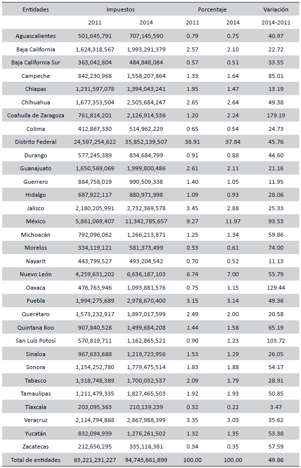 Eficiencia recaudatoria y competitividad estatales, 2011 y 2014