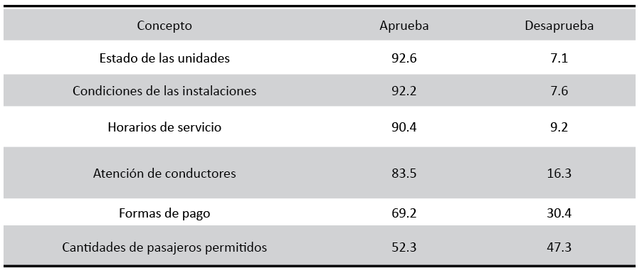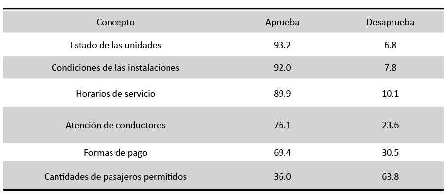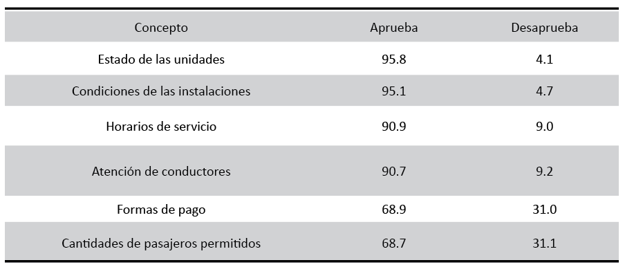 Con el propósito de profundizar en la opinión de los usuarios respecto a la calidad del servicio de transporte que brinda el Mexibús, en el Cuadro 2 se muestran diversas variables que permitieron conocer el grado de aprobación y desaprobación del servicio. El estado de las unidades obtuvo la mayor aprobación de los usuarios con 95.8%; los horarios de servicio, 95.1%; la atención del conductor, 90.9%, y finalmente las condiciones de las instalaciones, 90.7%. Contrariamente, los servicios peor calificados fueron tanto la cantidad de pasajeros permitidos, como las formas de pago, con 68.9% y 68.7%, respectivamente.