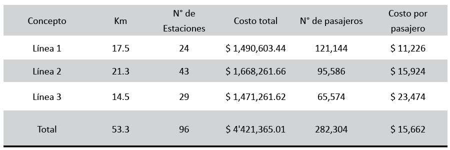 Al comparar el costo o la inversión total para impulsar el proyecto de cada línea, con el número de pasajeros transportados por cada una de ellas, se obtuvo el costo aproximado por pasajero. Los resultados indicaron que la línea 1, con un costo total real de 1.5 mil millones de pesos y un traslado de más de 121 mil pasajeros diarios, produjo el costo por pasajero más económico de 11,226 pesos, seguidos por la línea 2, cuya inversión total real implicó más de 1.6 mil millones de pesos, cifra que, comparada con los más de 95 mil pasajeros, implicó un costo promedio por usuario de 15,924 pesos; finalmente, si bien la línea 3 del Mexibús resultó ser la menos económica, al implicar una inversión real total de más de 1.4 mil millones de pesos, lo que, comparado con el transporte de más de 65 mil pasajeros diarios, arrojó un costo mayor de 23,474 pesos por pasajero.