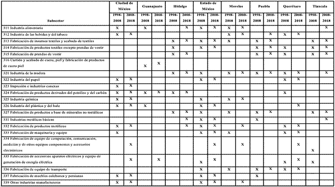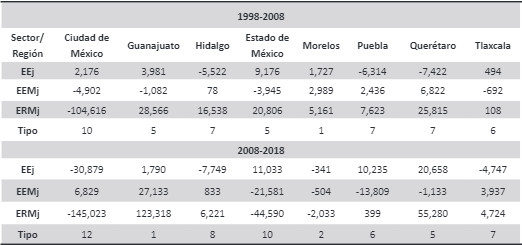 A su vez, el resultado es positivo en Guanajuato, Estado de México, Morelos, Ciudad de México y Tlaxcala (1998-2008), así como Querétaro, Guanajuato, Estado de México y Puebla (2018-2018), lo que refleja una especialización estatal en sectores de rápido crecimiento (química, maquinaria y equipo, plástico y hule, productos metálicos, equipo de transporte y aparatos eléctricos) a principios de cada periodo.