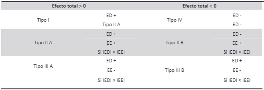 Al respecto, Stilwell (1969) establece una tipología al combinar el resultado de los efectos de cada región, como se muestra en el Cuadro 2. Argumenta que esta clasificación es más útil que la del shift and share tradicional, porque ayuda a identificar áreas que aún no sufren de la disminución de empleo, pero que es probable que lo hagan en el futuro. También se pueden identificar las regiones que tienen cambios netos en el pasado y cómo se podrían revertir en el futuro.