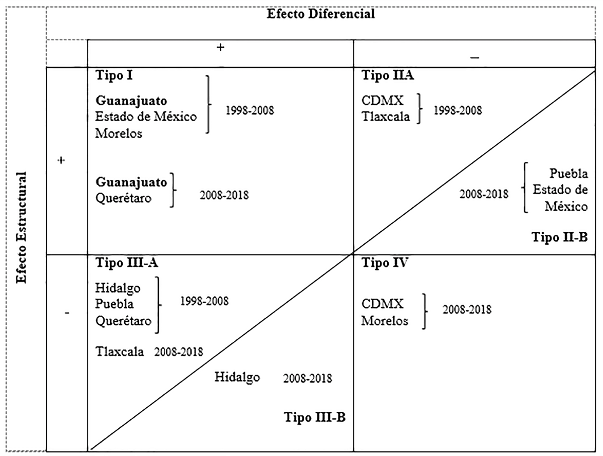 La diferencia entre el efecto inverso y el efecto estructural refleja la importancia del cambio estructural, denominado efecto estructural modificado, como se estableció en la sección metodológica. En el Cuadro 4 se puede observar un efecto positivo en Hidalgo, Morelos, Puebla y Querétaro para el primer periodo de estudio, lo que revela que la estructura regional estaba evolucionando en el periodo final hacia sectores productivos con un mayor dinamismo que a nivel regional. Estos estados, a excepción de Hidalgo, tenían una especialización particular, pero comparten una especialización en equipo de transporte. Por su parte, los estados con efecto regional modificado positivo fueron Guanajuato, Hidalgo, Estado de México, Morelos, Puebla, Querétaro y Tlaxcala, los cuales pueden clasificarse como “ganadores”.