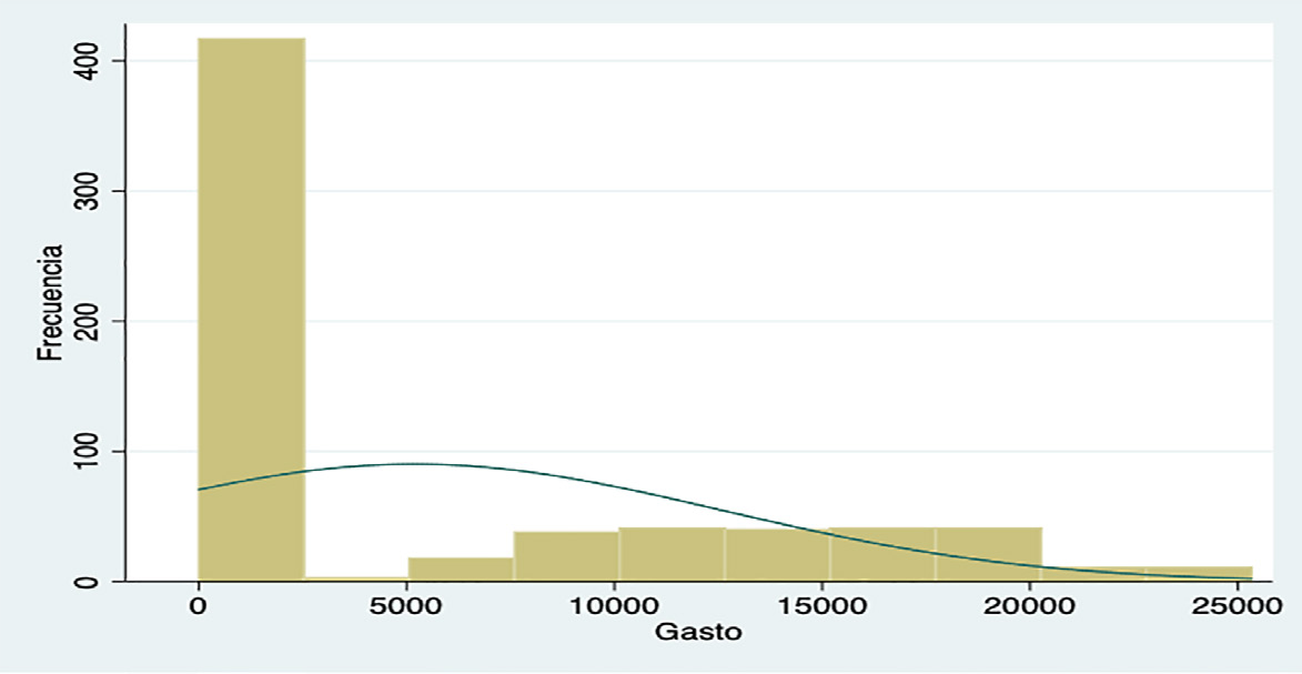 Una característica intrínseca de los datos de gastos de inversión de este tipo es que todas las observaciones sólo deben tener valores mayores que 0. Por esta razón, en muchos casos se presenta una asimetría positiva, debido a que se encuentra una proporción importante de los datos en 0. Sin embargo, en este estudio, 417 de los 661 micronegocios, equivalentes a 63.1% de las observaciones, no realizaron ningún tipo de gasto en e-commerce pese a que recibieron asesorías y cursos de capacitación sobre la importancia de vender y ofrecer sus productos y servicios por medio de plataformas de comercio electrónico. Además, es necesario destacar que existe una cantidad considerable de casos dentro de la muestra que tienen valores de gasto cercanos a 0, lo que refuerza la asimetría positiva de los datos, tal y como se observa en la Figura 1.