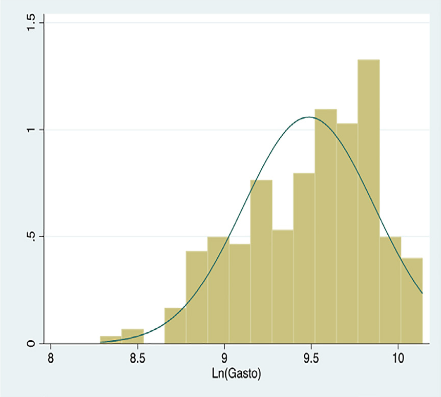 Conviene resaltar que, en este estudio, el modelo Tobit tipo I se corrió con la transformación logarítmica del gasto para disminuir la dispersión y evitar problemas de heterocedasticidad. Además, se obtiene una distribución que se asemeja más a una normal, como se muestra en la Figura 2.