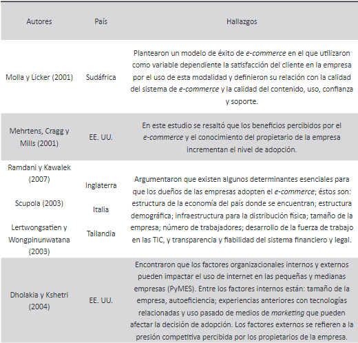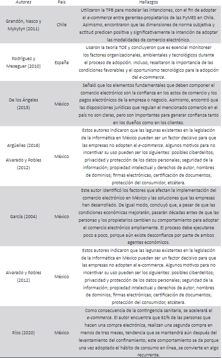 En la Tabla 1 se detallan los estudios realizados en algunos países sobre la adopción del e-commerce en las empresas. Es importante señalar que, de los trabajos descritos en el siguiente cuadro, son pocos los que se relacionan con los gastos en e-commerce en el contexto debido a la contingencia sanitaria. De ahí el interés por generar un aporte en estos temas desde un enfoque empírico.