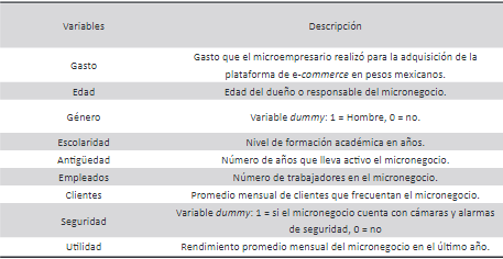 Para alcanzar el objetivo propuesto en esta investigación e identificar los determinantes que afectan el gasto de los microempresarios para adquirir una plataforma de e-commerce, se analizaron algunas características estructurales y socioeconómicas de los micronegocios, tal como se observa en la Tabla 2.