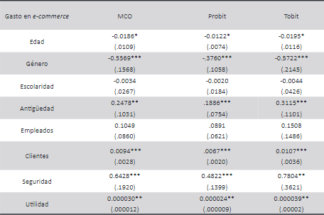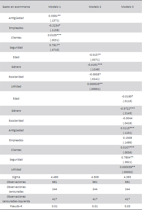 En la Tabla 4 se presentan los efectos marginales de los tres modelos Tobit con logaritmo del gasto en e-commerce como variable dependiente, que fueron aplicados en la investigación.3 En el primer modelo se incluyen las características estructurales del micronegocio; en el segundo se incorporan las características socioeconómicas del microempresario, y en el tercero se combinan ambas características (estructurales y socioeconómicas) para saber si tienen algún efecto en el gasto de e-commerce.