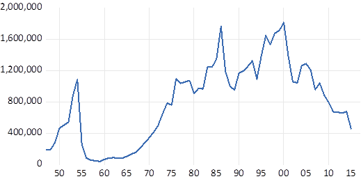 En la Gráfica 1 se ilustra la serie de inmigración. El primer incremento significativo se observa entre 1950 y 1955, que corresponde al periodo durante el cual el programa Bracero fue implementado. Después de una caída sustancial en la década de 1960, las aprehensiones repuntan para finales de 1970, y alcanzan su máximo alrededor de 1986, año en el que fue aprobada la reforma migratoria firmada por el ex presidente estadounidense Ronald Reagan. A partir del año 2000 se aprecia una caída sostenida, que se acentúa entre 2008 y 2010, muy probablemente debido a la crisis financiera que se experimentó en Estados Unidos y la recesión que le acompañó.