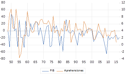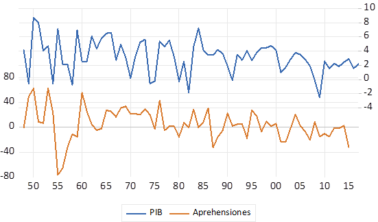 En la Gráfica 2 se presenta la tasa de crecimiento anual del PIB en Estados Unidos, conjuntamente con la tasa de crecimiento de la serie de inmigración. A primera vista no es posible identificar una relación clara entre las series, aunque se podrían mencionar algunos episodios interesantes. Por ejemplo, la caída sustancial de la inmigración alrededor de 1955 coincide con un incremento en el PIB; algo similar sucede entre 1960 y 1965. Durante la recesión de principios de 1980 se observa un estancamiento en la inmigración. Quizá lo que más llama la atención es que durante la recuperación económica en Estados Unidos, después de la Gran Recesión de 2009, la tasa de aprehensiones no aumenta, sino que disminuye para 2014 y 2015.