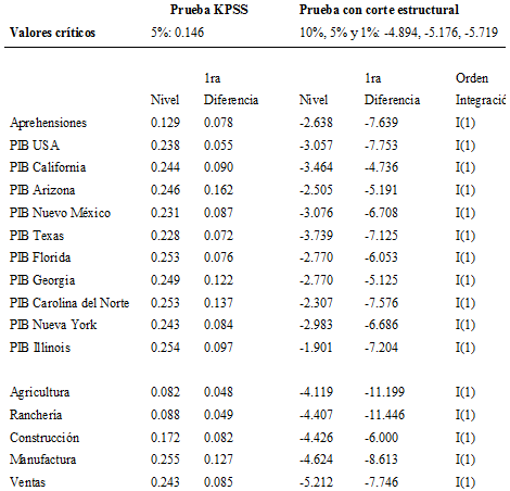 El flujo de inmigración ilegal se mide por medio de las aprehensiones en la frontera México-Estados Unidos; esta medida se ha empleado en diversos documentos, incluyendo Hanson y Spilinbergo (1999) y Cornwell (2009). La información se obtuvo de las bases de datos del U.S. Department of Homeland Security. El PIB agregado y estatal se obtuvieron del Bureau of Economic Analysis. Los estados que se consideran en el estudio son California, Arizona, Nuevo México, Texas, Florida, Carolina del Norte, Illinois, Nueva York y Georgia, que, de acuerdo con el Migration Policy Institute, representan los de mayor población indocumentada. La actividad industrial se mide por medio del empleo en algunas de las industrias en las que los inmigrantes representan una proporción significativa de acuerdo al Pew Research Center: agricultura, ranchería, construcción, manufactura y ventas; los datos se obtuvieron del Bureau of Labor Statistics. Para todas las variables el periodo abarca de 1947 a 2015, excepto para el PIB estatal, que se encuentra disponible desde 1963. La periodicidad es anual y las cifras de PIB estatal se convirtieron en cifras reales y deflactaron el PIB nominal por el índice de precios al consumidor base 1982-1984.
