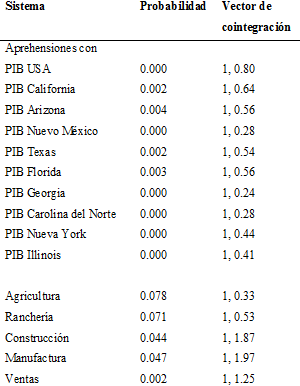 El análisis empírico inicia con una evaluación de las propiedades de estacionariedad de las series. Los resultados de las pruebas KPSS y Dickey-Fuller modificada se presentan en el Cuadro 1. Para la totalidad de las series se encuentra un orden de integración de 1. Con base en la Gráfica 1, el nivel de la serie de aprehensiones parece exhibir una tendencia positiva de 1955 a 2000, mientras que el ciclo de la misma es evidentemente estacionario a juzgar por la ilustración de la Gráfica 2. Así, resulta razonable encontrar que la serie sea I(1). Para el caso del PIB de Estados Unidos, la literatura relevante sugiere que la serie es no estacionaria en niveles, pero estacionaria en primera diferencia. A pesar de que a la fecha continúa el debate sobre la naturaleza estocástica del PIB estadounidense, podemos afirmar que existe suficiente evidencia para afirmar en nuestro análisis que las series se encuentran integradas de orden 1 (véase, por ejemplo, Cushman 2016). Los PIB de los estados incluidos en el análisis se comportan de manera similar al PIB agregado, por lo que el resultado aquí obtenido es razonable. Respecto a las variables de empleo, las gráficas 3 y 4 muestran claramente que el nivel de las series de construcción, manufactura y ventas presentan una tendencia y que su ciclo es estacionario. Para las series de agricultura y ranchería, la evidencia de la Gráfica 5 no es tan contundente, mientras que desde el inicio de la muestra al año 2005 se aprecia una tendencia negativa; a partir de entonces parece que el empleo experimenta una expansión. Las primeras diferencias son visiblemente estacionarias (Gráfica 6). A pesar de la falta de claridad para estas series, tomamos los resultados de las pruebas estadísticas y concluimos que se encuentran integradas de orden 1.