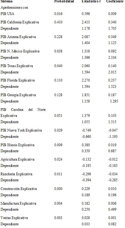 Para la estimación GIV se consideran dos sistemas con el propósito de identificar cuál serie presenta un efecto sobre la otra: uno en el que la variable dependiente es la serie de aprehensiones y otro en el que la variable dependiente es la serie económica. Así, en el cuadro se reportan dos filas para cada serie de activad económica, una que se etiqueta “Explicativa” (la variable económica es la variable independiente) y otra “Dependiente” (la variable económica es la variable dependiente). La única excepción es el PIB agregado, ya que razonablemente no se esperaría que los flujos de inmigración ilegal influyan sobre el PIB de Estados Unidos significativamente. Para esta variable únicamente se considera al PIB como variable explicativa de las aprehensiones.