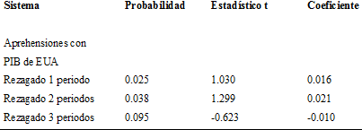 En el Cuadro 4 también se reportan los resultados de la regresión que evalúa el efecto del PIB sobre las aprehensiones. Para todos los rezagos el coeficiente no es significativo. Una vez más, esto es consistente con el argumento de que existen factores, además del PIB, que influyen sobre la migración ilegal. Como se mencionó, el diferencial salarial puede ser uno de ellos, o simplemente las redes de familiares y conocidos con los que los migrantes cuentan en Estados Unidos.