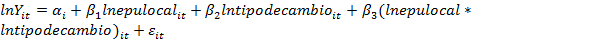 es el término de error. Para definir m consideramos el índice de incertidumbre de política económica local, el tipo de cambio y su término de interacción. Por lo tanto, con base en la ecuación (1), se estima la ecuación (2):