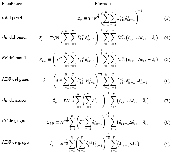 Posteriormente, se calculan siete estadísticos de panel, expresados en las ecuaciones (3) a (9) con los términos apropiados de ajuste de media y varianza como en Pedroni (1999), para quien el panel heterogéneo y las estadísticas de cointegración del panel medio del grupo heterogéneo se calculan de la siguiente manera (Lee, 2005):