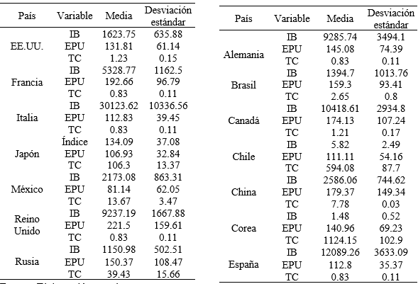 El índice de incertidumbre de la política económica es un indicador propuesto y publicado por Baker et al. (2016) y se estima a partir de las menciones en los encabezados de periódicos de las palabras incorporadas en tres segmentos E (economía), P (regulación), banca central, militar, guerra, reserva federal y todos los conceptos relacionados con figuras e instituciones políticas), y U (incertidumbre/incierto). Ellos utilizan un método de regresión y publican los resultados de las 22 principales economías mundiales con base en su participación en el PIB global. Para este trabajo se consideran los índices de EPU para cada país.