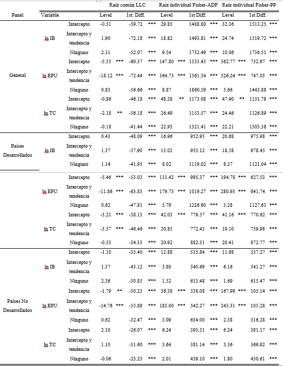 Las tres pruebas se realizan tanto en niveles como en primeras diferencias. Cabe señalar que las pruebas de raíz unitaria de sección transversal tienen ventajas sobre las pruebas de raíz unitaria para series de tiempo.