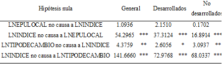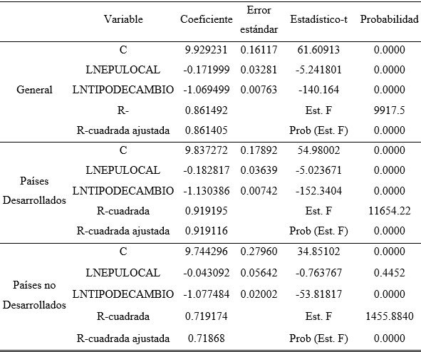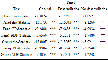 Los estadísticos de cointegración de panel, basados en un modelo de efectos fijos, muestran que el estadístico panel ν acepta la hipótesis nula de no cointegración. Los tres estadísticos restantes (ρ, PP y ADF) coinciden en rechazar la hipótesis nula; es decir, existe evidencia de la relación de cointegración entre las variables.[8] Asimismo, los tres estadísticos de cointegración de panel de medias de grupo rechazan la hipótesis nula, tanto en el panel general como en el de países desarrollados, mientras que en el panel de países no desarrollados sólo lo hacen dos. Con base en estos resultados se evidencia la existencia de una fuerte integración entre las series.