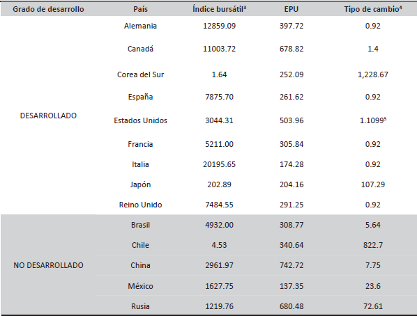 Los países fueron elegidos con base en la disponibilidad de los datos, es decir, aquellos para los que se publica el índice EPU y para los cuales hubiera disponibilidad de información bursátil y cambiaria para el periodo propuesto, considerado idóneo, ya que incorpora periodos de incertidumbre y relativa calma, además de proveer un número de datos suficiente para la estimación