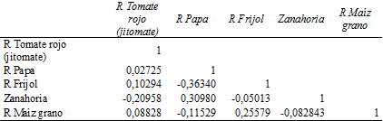 Una interpretación bajo este contexto sería dejar de sembrar 29.2% maíz de grano y 9.7% de cebolla, lo que no suena del todo lógico. Otra alternativa es considerar sólo aquellos cultivos que presenten una correlación débil entre ellos, entendida como el hecho de que los elementos fuera de la diagonal de la matriz son pequeños en relación con los elementos diagonales de unos de la matriz (Best y Grauer, 1992). Cuando se impone esta restricción, los cultivos que sobreviven son: tomate rojo, papa, frijol, zanahoria y maíz grano. Sin embargo, esta solución debilita todo el embalaje teórico de la propuesta de frontera eficiente.