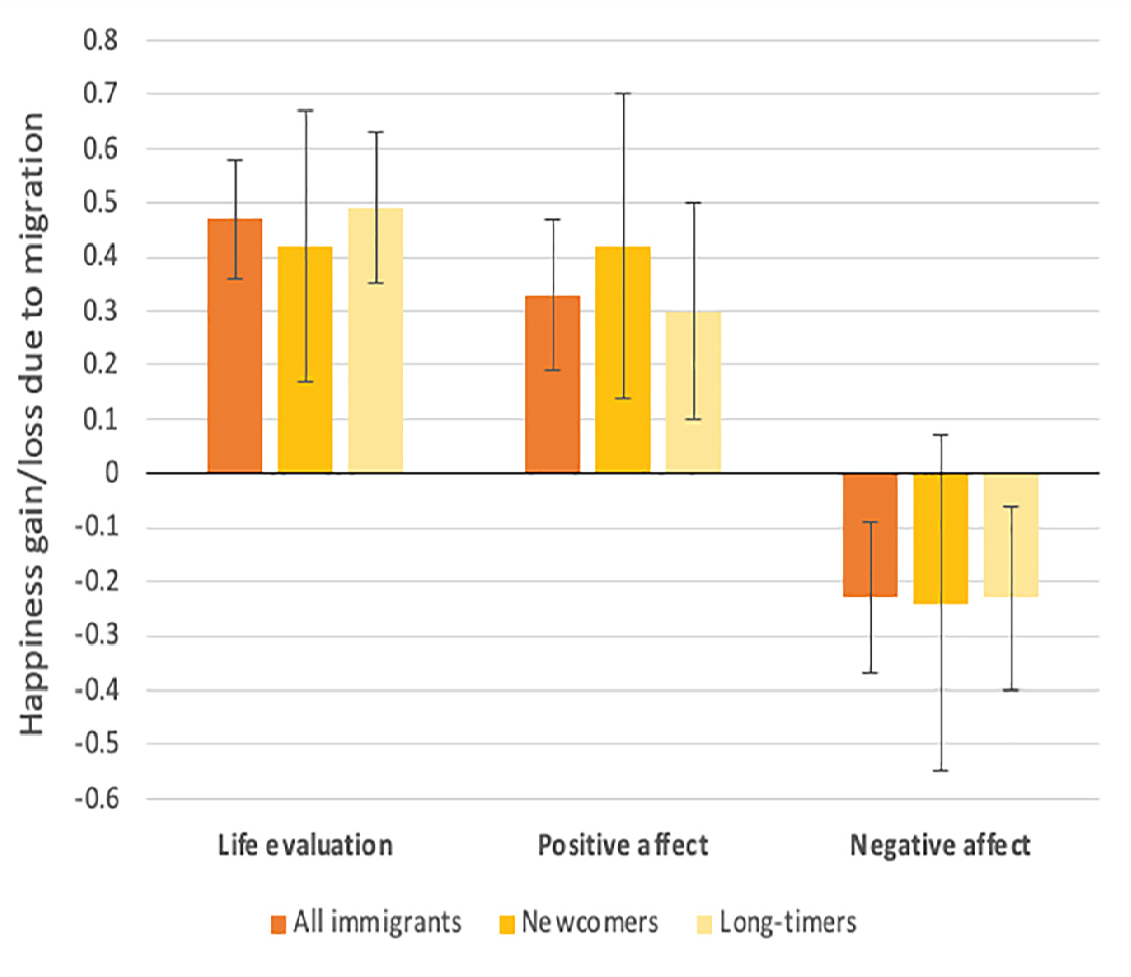 Comparando al migrante con migrantes potenciales con las mismas características de su país de origen usando los datos Gallup World Poll, es estimado que migrantes los a nivel mundial evalúan la calidad de sus vidas en promedio un 9% más positivo después de la migración. También experimentan aproximadamente un 5% de emociones más positivas y un 7% menos de emociones negativas debido a la migración. La mayoría de estas ganancias de felicidad se experimentan dentro de los primeros cinco años después de la migración. Las familias que quedan atrás generalmente evalúan sus vidas de manera más positiva, pero con frecuencia experimentan más emociones negativas.