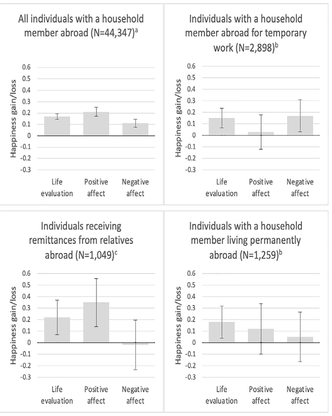 This group of migrant workers is characterized by great diversity, ranging from female nurses from the Philippines to male construction workers from Latin America. The household member abroad can, however, also be another family member (e.g., a child or sibling) or move for different reasons (e.g., for study purposes). Household members left behind are likely to be the migrant’s spouse, children, parents, siblings, or other extended family members. The results, presented in the upper left panel of Figure 3, show that individuals with a household member abroad typically evaluate their lives more positively and experience more positive affect than their counterparts without a relative abroad. However, they also experience more negative affect.