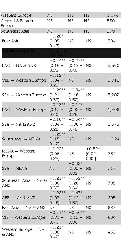 Table 1 shows the happiness outcomes in some of the largest migration flows within or between ten world regions: Latin America and the Caribbean (LAC), sub-Saharan Africa (SSA), the Middle East and North Africa (MENA), South Asia, Southeast Asia, East Asia, the Commonwealth of Independent States (CIS), Central and Eastern Europe (CEE), Western Europe, and finally, Northern America combined with Australia and New Zealand (NA & ANZ). We highlight the most important results.