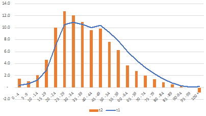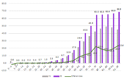 En medio de este problema, un elemento fundamental fue el poder de control de las vacunas frente a la capacidad de diseminación del virus: el promedio diario de contagios bajó de 5,295, entre el 27 de febrero de 2020 y el 4 de abril de 2021, a 3,613, entre el 4 de abril y el 13 de julio de 2021, una reducción de 32%. Por edades, distribuidas en quintiles, las diferencias se muestran en la Gráfica 5. En el primer periodo (t1), cinco quintiles con las edades de 25 a 49 años concentran 52.3% de las personas contagiadas. En el segundo (t2), tan sólo cuatro quintiles de 20 a 39 años concentran 45.4%. El pico de edad en el primer caso es el quintil de 30 a 34 años; en el segundo es el de 25 a 29 años. Es decir que, en cuanto a personas contagiadas, la edad promedio se redujo cinco años de un periodo a otro, aunque se observa una mayor concentración en personas muy jóvenes. Incluso si se divide a éstas en dos grupos de edad, de 0 a 39 años, y de 40 a 100 y más años, se aprecia que hasta el 4 de abril de 2021 el primer grupo concentraba 44%, y a partir de esa fecha hasta el 13 de julio concentró 55%. Así, a partir de la aplicación masiva de vacunas y el ingreso de nuevas variantes del virus SARS-CoV-2, en particular la B.1.1.59 mexicana, Alfa, Gamma y Delta, los contagios de personas de hasta 30 años aumentaron aproximadamente 25%, en contraposición con quienes tienen 40 años y más.