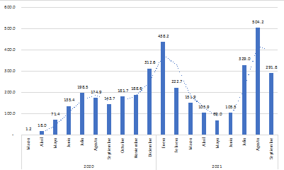 Por lo que respecta al caso mexicano, desde un principio se hizo evidente que las cifras arrojaban incongruencias, dada la excesiva y persistentemente elevada tasa de letalidad, atribuida a la posible desproporción con que se contabilizaba el denominador respecto al numerador. Lo anterior encontraba su principal explicación en el hecho de que el sistema oficial sólo considera como fallecimientos por la Covid-19 aquellos que se registran en un nosocomio de la red hospitalaria nacional, de los que hay 475 en todo el país, conocidos como Unidades de Salud Monitora de Enfermedad Respiratoria Viral (Usmer). Sin embargo, para ser recibido en alguno de ellos, los familiares de los pacientes reportan que es requisito contar con un examen que evidencie la presencia del virus, el cual debe hacerse en un laboratorio, lo que implica trasladar al paciente en condiciones precarias, arriesgando aún más su vida, o incluso tener que pagar una ambulancia, lo cual resulta varias veces más costoso que de costumbre, pues los precios de todos los servicios hospitalarios y de apoyo, así como de los medicamentos, subieron extraordinariamente en las fases más agudas de la pandemia: junio septiembre de 2020, diciembre 2020-febrero 2021 y julio-septiembre de 2021, como indica la Gráfica 1.