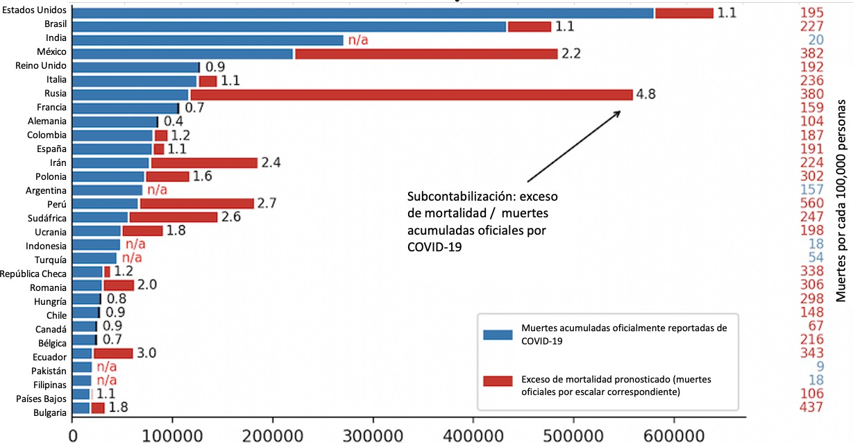 No obstante, existe una clara subcontabilización de las personas fallecidas por la Covid-19, cuya cifra oficial debería ser expandida por un factor cuyo rango se mueve entre 1.75 y 2.2, deducido a partir de las cifras sobre exceso de mortalidad dadas a conocer en diferentes momentos por las instituciones oficiales de estadísticas y de salud, la subcontabilización de las personas contagiadas podría ser comparativamente mayor, debido a la dificultad de los enfermos para ser considerados en los registros. Esto explicaría por qué México ha tenido la tasa más alta de letalidad acumulada del mundo, 9.4% al 1 de junio de 2021 y 7.5% al 11 de octubre de 2021, mientras el promedio internacional es de 2.2 por ciento.