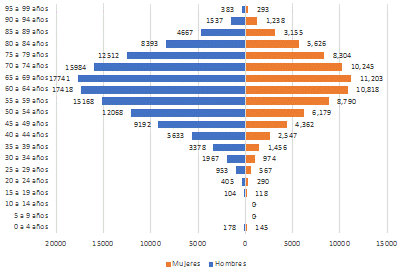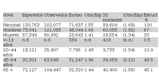 Como se observa, hubo una diferencia de 71,687 entre las personas fallecidas del 1 de enero al 19 de julio de 2020 y las cifras históricas registradas en iguales meses de 2015 a 2019 (en el cuadro se hace un ajuste para incluir a las personas de 19 años y menos que habían sido omitidas en el cálculo original de la Ssa), lo que lleva implícito un factor de expansión de 1.55 (202,077 observados/130,763 esperados). Si se agregan las entidades faltantes del país, entre las que se encuentran algunas tan grandes y afectadas por la Covid-19 como Jalisco, Sinaloa, Tabasco, Tamaulipas, Guerrero, Oaxaca y Chiapas, y se guardan las proporciones poblacionales y de congruencia por la Covid-19, la cifra sube a 89,609 fallecidos (el dato de exceso para 20 entidades se expande por 1.25). Dicha cantidad es 2.25 veces más alta a la de fallecimientos por la Covid-19 reportada hasta el 19 de julio de 2020 por la Ssa (39,184). Dos tercios fueron hombres y un tercio mujeres, y por edad 45.1% tenían 65 años y más, y 43.5% estaban entre 45 y 64 años. La diferencia de 11.4% corresponde a personas de 0 (nonatos) a 44 años y permite corroborar las dificultades que enfrentaba hasta mediados de2020 el sistema de salud de México, ya que en otros países la muerte de personas de esa edad era proporcionalmente más baja, e incluso excepcional entre menores de 20 años.