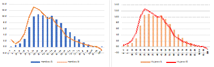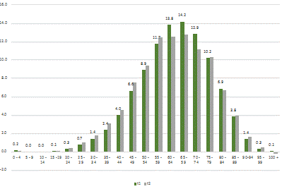 En la cuarta sección se hace un análisis detallado de las estructuras por edad y sexo de los contagios y defunciones a partir de principios de 2020, divididas en dos periodos: desde la irrupción de la enfermedad en México hasta el 4 de abril de 2021 (poco más de 13 meses efectivos de actividad) y desde esta última fecha hasta el 13 de julio de 2021 (poco más de tres meses), con el objetivo no sólo de deducir información clave sobre el problema (promedios de edad de las personas contagiadas y fallecidas, rangos de edad en que se observa la mayor concentración, diferencias entre población contagiada y fallecida por sexo, etcétera.),sino también sobre qué tanto cambió el patrón de los contagios y fallecimientos con la aparición de la variante Delta, al tiempo que se masificaba la aplicación de las vacunas para combatir el virus SARS-CoV-2.