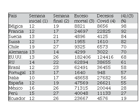 Entre enero y julio de 2020 el número total de personas fallecidas en el país superó en aproximadamente 25% al promedio de los periodos semejantes de los cinco años previos, problema en su mayoría explicado por la Covid-19. Esto significa que, en materia de fallecimientos por esta causa, y aún considerando los problemas de subconteo de otros países, México podría no encontrarse en el cuarto lugar mundial, debajo de EE.UU., Brasil y la India, sino cerca del tercero.
