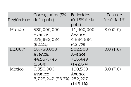 A partir de las cifras indicadas, los porcentajes entre paréntesis de las dos últimas columnas muestran que, proporcionalmente, al 11 de octubre de 2021 México había avanzado 2.5 veces más rápido en el número de fallecimientos que de enfermos, mientras que EE.UU. se encontraba en 0.54 veces, y el mundo en 0.68 veces. Aunque en los tres casos la tasa de letalidad esperada al cierre del ciclo es la misma, 3.0%, si se atiende a la que había registrado cada país/región al 11 de octubre de 2021, se aprecia lo siguiente: tasa mundial de letalidad, 2.0%; tasa estadounidense,1.6%; y tasa mexicana, 7.6% (última columna). Hasta esa fecha, el número de personas contagiadas en EE.UU. superaba en 2.6 veces ala población que originalmente se esperaba se contagiaría durante todo el periodo de pandemia, cifra que contrasta con los avances de 0.628 para el mundo y 0.587 para México. Por su parte, los fallecidos en el primer país superaban en 42.6% a los estimados para todo el lapso, en 48.1% en México, y llegaban a menos de la mitad (0.42) en el mundo.