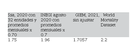 Al dividir la cifra de exceso de mortalidad de 89,609 entre el número de meses de 2020 en que se registraron fallecimientos por la Covid-19, compatibilizados con el periodo de levantamiento de datos de la Ssa (cuatro meses, del 18 de marzo al 19 de julio), se obtiene un promedio mensual de 22,402 personas fallecidas en exceso. Si se compara esta cifra con el número de fallecimientos por la Covid-19 promedio mensual acumulado y reportado a esa fecha por la Ssa (2021a), se obtienen 39,184 personas. Esto sugiere una subestimación de personas fallecidas por parte de la Ssa de 43%. En otros términos, la cifra de la Ssa debió haberse expandido por 1.75 a fin de acercarse a la cifra exacta de fallecimientos.