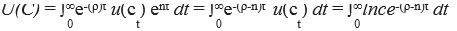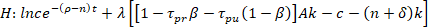 (2)donde ρ es una constante que representa la tasa de descuento, n es la tasa de crecimiento de la población, u es la utilidad, ct es el consumo per cápita. Se asume que la función de utilidad es logarítmica para asegurar que sea cóncava y, por tanto, las trayectorias encontradas en la solución del hamiltoniano garanticen la máxima utilidad.