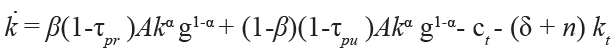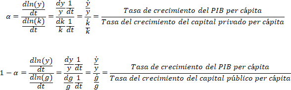 donde A indica la tecnología, k es el factor de producción capital privado per cápita, g es el factor de producción gasto público per cápita, α es la elasticidad capital privado per cápita-producto per cápita; es decir, la fórmula muestra en qué porcentaje se incrementa la producción per cápita cuando aumenta el capital privado per cápita en 1%. Por su parte, (1− α) es la elasticidad gasto público per cápita-producto per cápita. Como es habitual, se asume que 0< α <1 con la finalidad de asegurar que la función de producción sea cóncava.